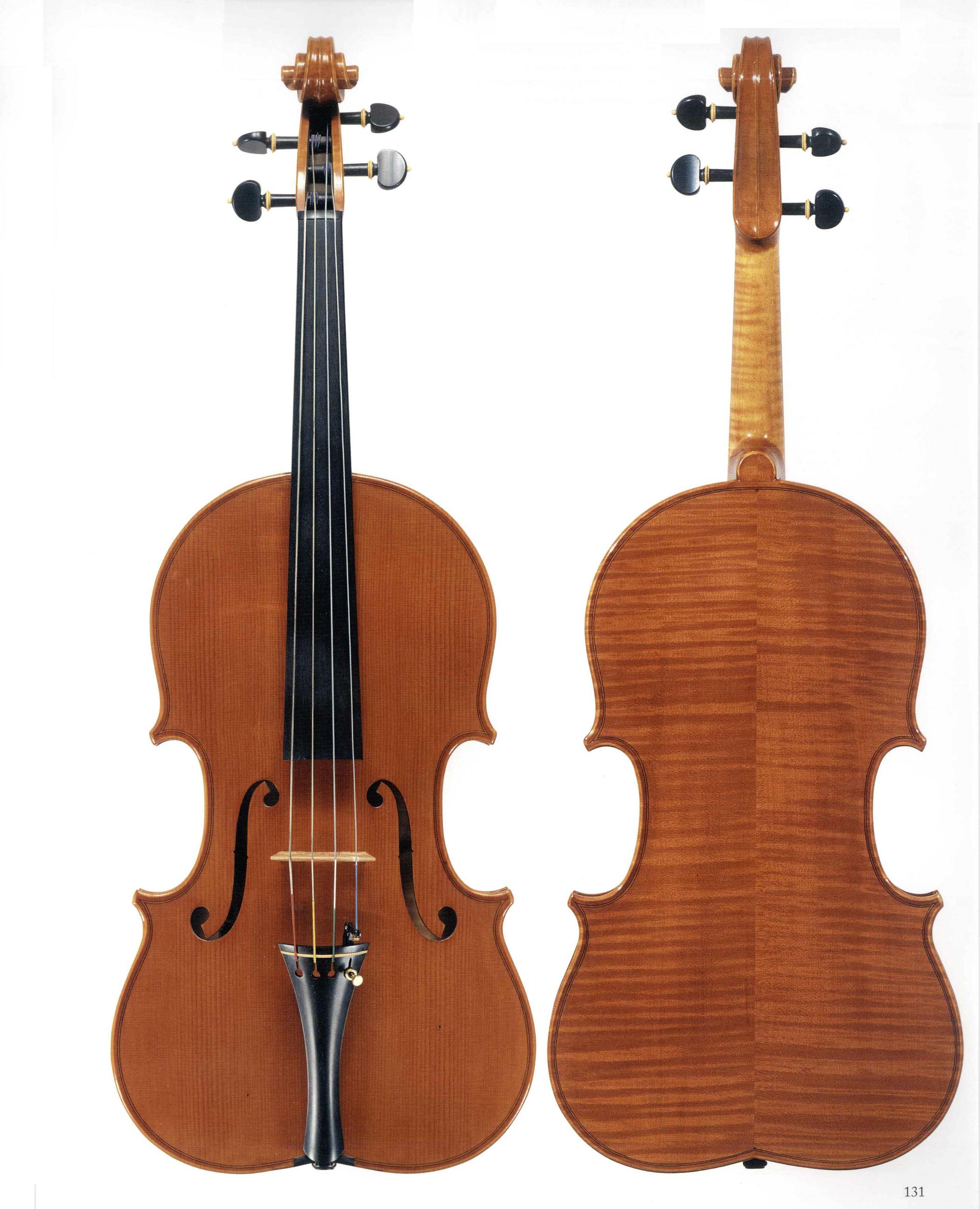 This intrument has the body with the same shape and size as a lira da braccio. The ribs are 33 mm high and the body is 395 mm long. The f-holes are after Gasparo da Salo' and so is the scroll. To make the body I used a lira da braccio mould my father Francesco got from a drawing of an original lira which is now in the Museum of Musical Instruments of Bruxelles. The f-holes and the scroll are after models of Simone Fernando Sacconi and are drawn from an original viola he restored in the 1960s and kindly gave my father. This instrument is a real hybrid with the diapason and the length of the neck is like a small viola. I'm very proud of this experiment and I think I really did my best. This instrument can be perfectly played and sounds like a small viola.