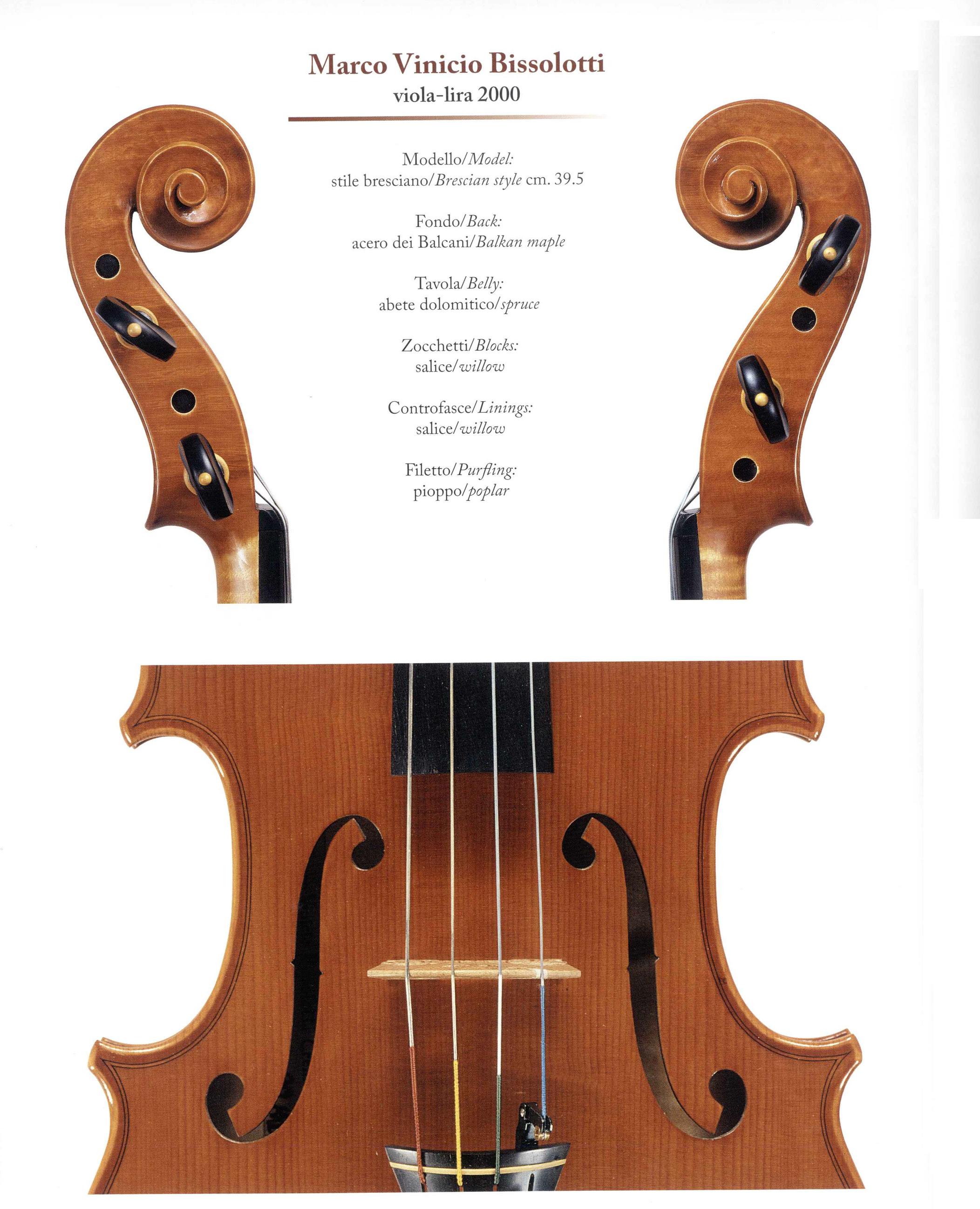 Questo strumento ha la caratteristica di avere la cassa con la forma e dimensioni di una lira da braccio. Le fasce sono alte 33mm come la lira e la lunghezza è di 395mm. Le effe sono di modello Gasparo da Salò come del resto la testa. Per la costruzione della cassa ho usato un modello di lira da braccio di mio padre Francesco che ha ricavato da un disegno di una lira originale che si trova nel Museo degli strumenti di Bruxells, mentre le effe e la testa sono modelli di Simone Fernando Sacconi ricavati da una viola originale da lui restaurata negli anni sessanta e gentilmente donati a mio padre. Questo strumento è a tutti gli effetti una sorta di ibrido con diapason e lunghezza del manico di una piccola viola. Questo è stata un sperimentazione di cui vado fiero e che credo di aver eseguito al meglio delle mie possibilità. Questo strumento è perfettamente suonabile ed il suono è quello di una viola di piccole dimensioni.