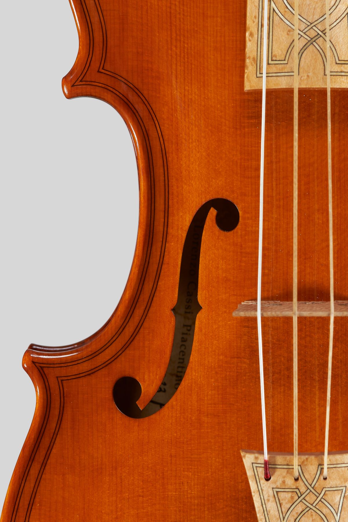 Violino Gasparo da Salò 1580 realizzato dal Maestro liutaio Lorenzo Cassi, fondo intero in acero occhiolinato e marezzato con doppio filetto e tre arabeschi decorativi. Tavola in un sol pezzo di abete rosso delle Dolomiti. Tastiera e cordiera nello stesso legno del fondo, intarsiate con filetto. Piroli e bottone intagliati a mano. Capotasti in osso.